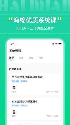 2、其中包括海绵全程班数学、英语逻辑和写作等科目的10年以上真题,共计5000多道,题量非常大。