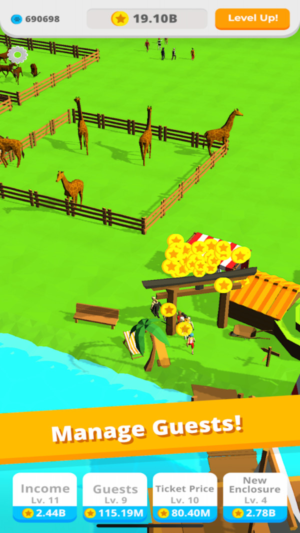 3.在不断的经营过程中赚取金币,以此才能不断扩建自己的动物园。