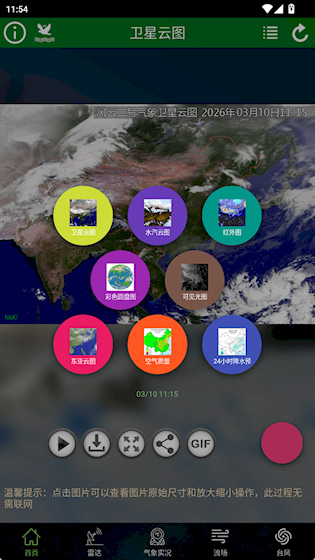 1、 多图层切换:提供真彩色、红外、水汽等多种云图模式,用户可自由切换查看不同维度的大气状况,满足多样化观测需求。