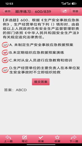1、在顺序练习中,用户可以浏览到每一道题目,并通过“答案”功能获取该题目的正确答案。