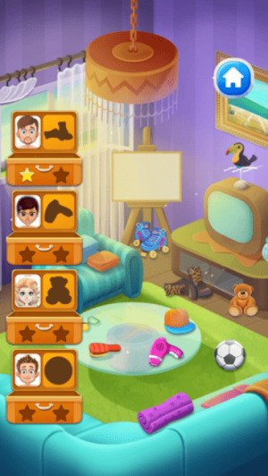 1、进入游戏后观察游戏界面,找到并点击茶几上的棕色行李箱,获取角色换装所需的衣物。