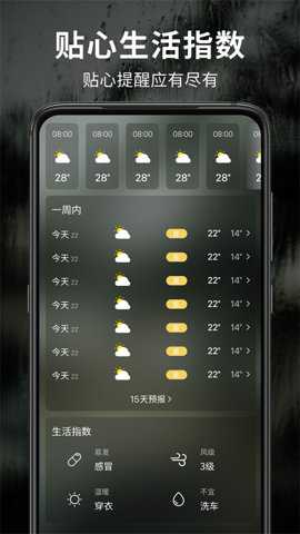 2、该应用还提供生活指数功能,可以综合考虑晴天雨天各项指数,让用户轻松安排户内外活动。