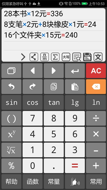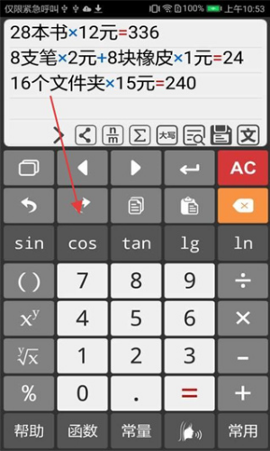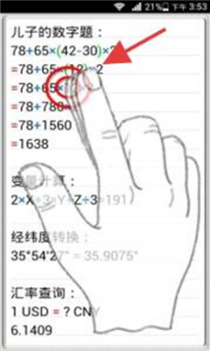 2、可进行复杂数学运算,如孩子的数字题,按运算顺序依次输入数字和符号,即可得出最终答案。