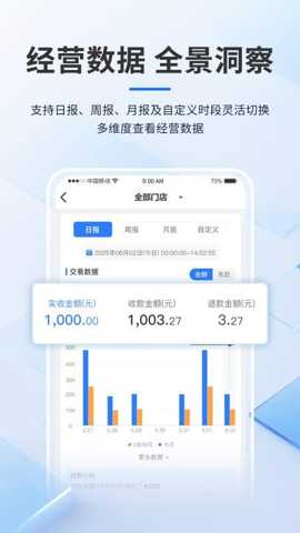 3、提供了清晰的经营数据信息,商家可以通过应用在线洞察全景,实时查看交易数据的变化。