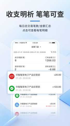 1、获取清晰的收支明细收款信息都以直观的方式呈现,使得商家能够快速了解每一笔收款的具体情况。