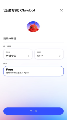 1、用户需要设定Bot的名称与对话风格,并选择免费模型及ClawSpace节点资源,最后点击【创建】按钮。
