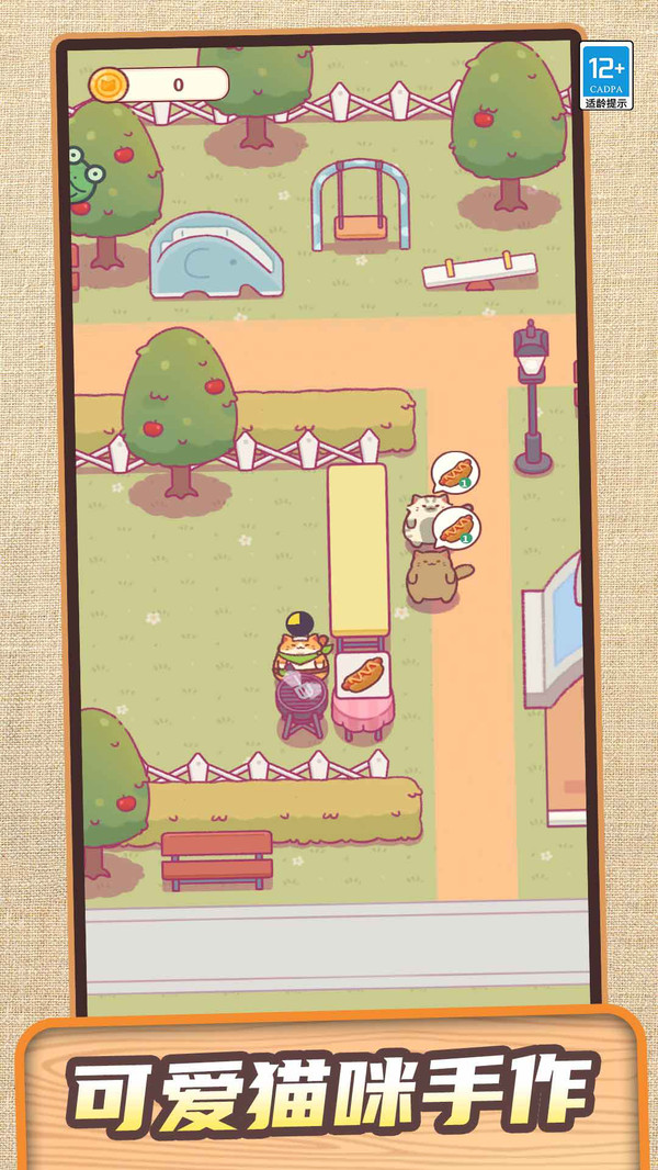 1、开局选摊位,操控猫咪制作、售卖热狗,满足顾客需求获金币 。