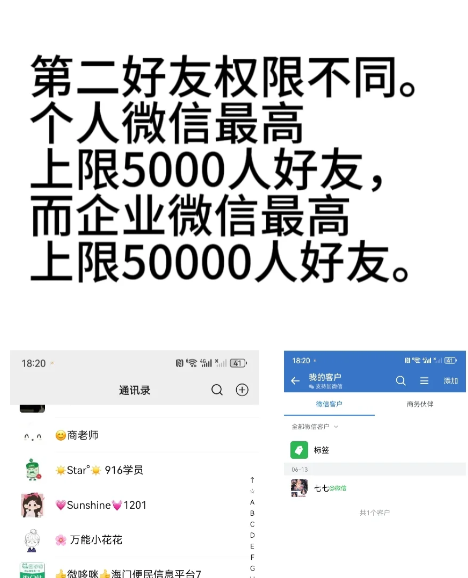 个人微信最高上限5000人好友,而企业微信最高上限50000人好友。
