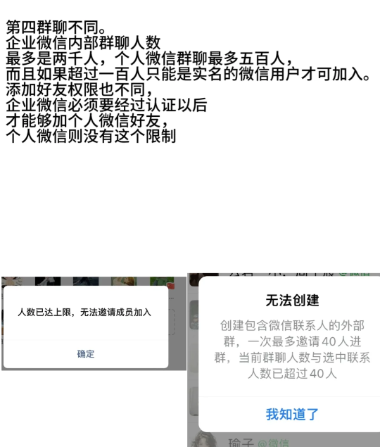 企业微信内部群聊人数最多是两千人,个人微信群聊最多五百人,而且如果超过一百人只能是实名的微信用户才可加入。