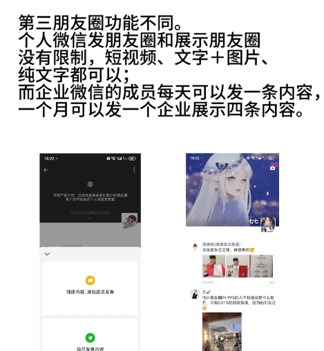 而企业微信的成员每天可以发一条内容,一个月可以发一个企业展示四条内容。