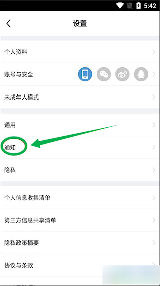 3、进入设置页面,点击【通知】。