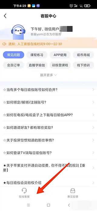 1、打开每日瑜伽,根据页面提示找到客服入口。