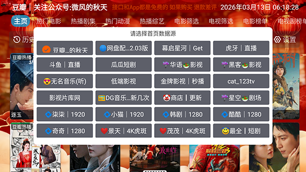 1、软件自带影视源接口配置,点击主页选项可以进行切换。