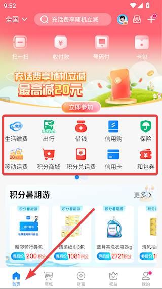 1、【首页】提供了丰富的实用功能,例如:生活缴费、移动话费、积分商城、积分兑话费等
