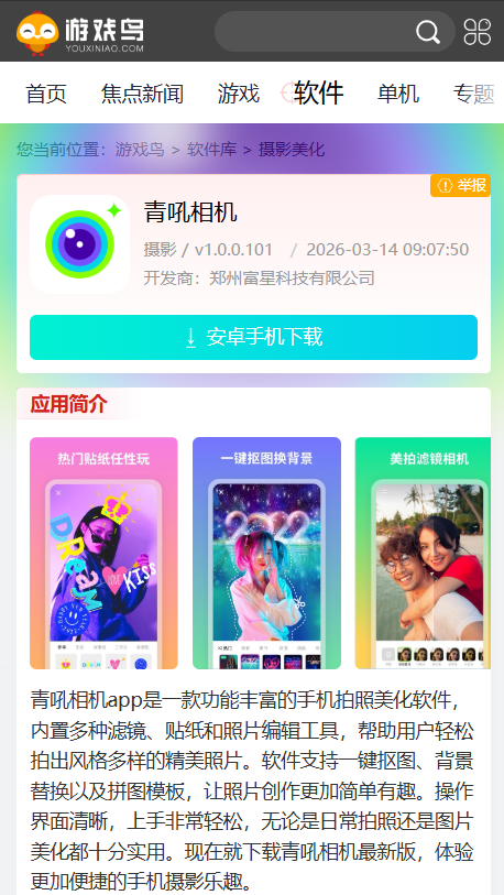 青吼相机app是一款功能丰富的手机拍照美化软件,这里有自带的滤镜、贴纸和修图小工具,随手一拍就能调出好看又不一样的照片。点一下就能把人物和背景分开,能换背景、拼图片,用起来简单又好玩。界面看着清楚,不用学就能会,平时拍生活照、修图都很好用。直接下载青吼相机,用手机拍照修图会更方便,随手就能拍出好看的画面。