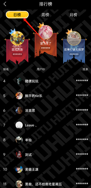 3、找到平台排行榜功能,可根据日榜、周榜、月榜三种类型,查看对应排名情况。