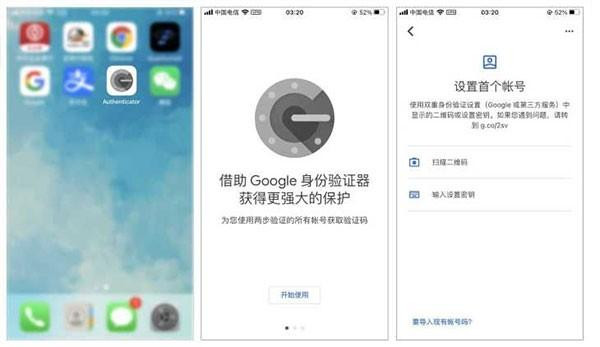 7、打开手机上的谷歌验证器app,通过扫码或者选择“无法扫码”手动输入秘钥