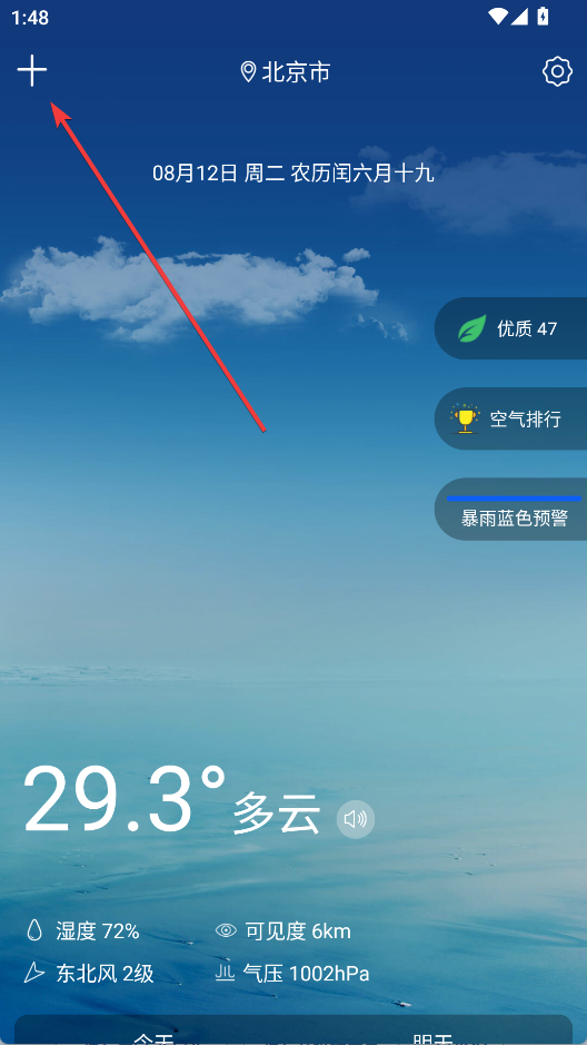 1、打开知趣天气app,点击左上角的+进入城市管理界面