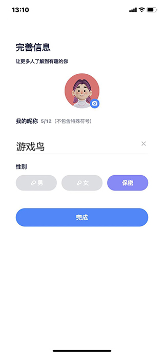 2、完善个人信息,包括昵称、头像和性别,性别可选择保密模式,保护个人隐私。