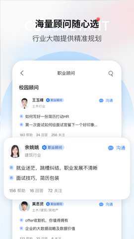 2、除此之外,还提供了【职业顾问】功能,根据个人的困惑和需求,为求职者选择相匹配的职业顾问,提供个性化的指导和建议。