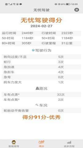 1、无忧驾驶是一款全功能的驾驶行为检测软件,除了弯道偏离告警功能外,还包括直线蛇行、急加速、急刹车、急转弯等功能。