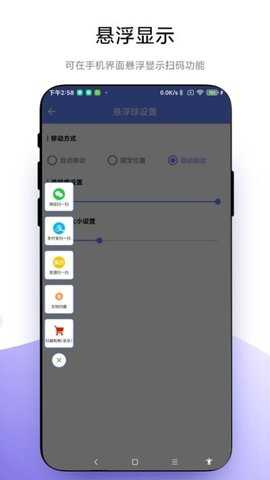 1. 悬浮扫描功能,用户无需打开软件,只需在手机屏幕上悬浮扫描即可快速扫描码型。