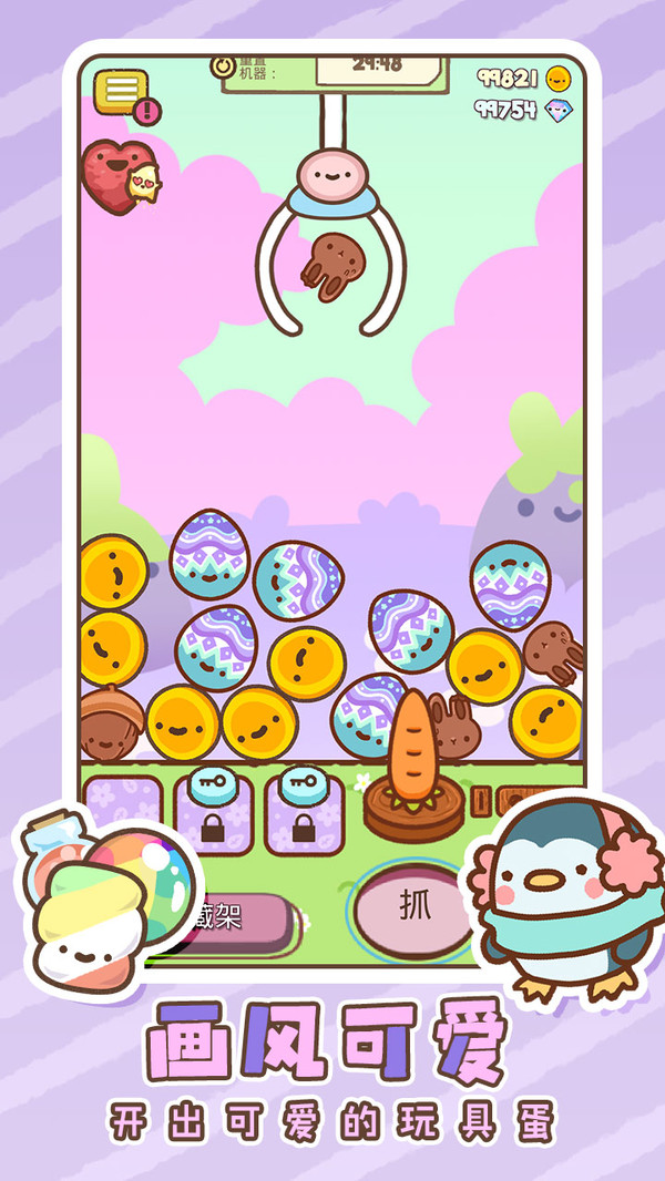 3、借助抓娃娃机器,开出更多的可爱的玩具蛋。