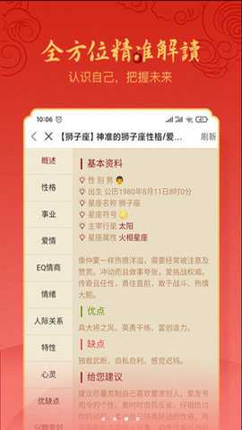 生肖运势:选择自己的生肖,查看年度或月度运势。