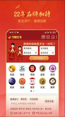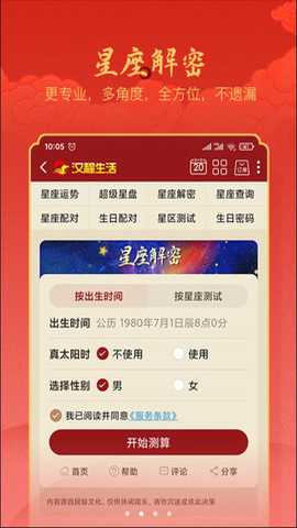 多种民俗测算功能:汉程生活支持八字排盘、黄历查询等多种民俗测算功能,满足用户对不同文化测算的需求。