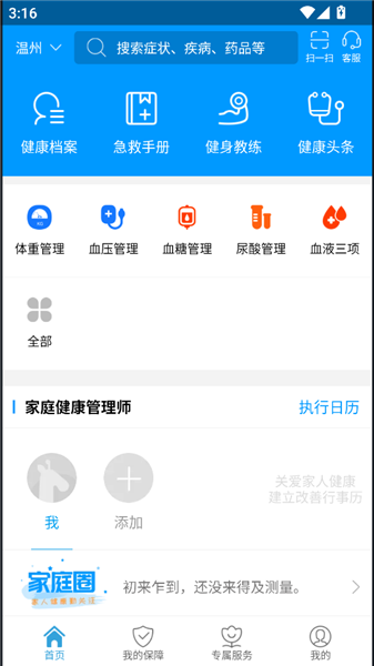 1、在软件首页界面下,我们能够进行体重管理、血压管理、血糖管理、尿酸管理等一系列操作。