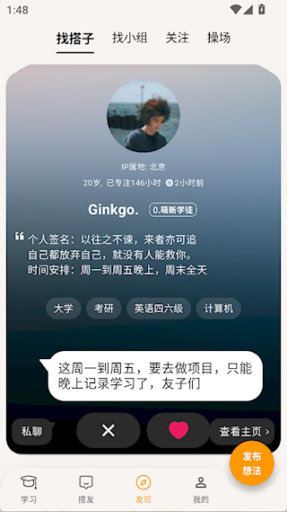 1、 备考冲刺:适合准备各类资格考试人群,寻找同样目标的搭子互相监督复习进度,共同攻克难关迎接挑战。