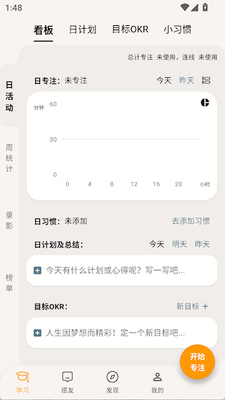 1、进入学习界面,通过看板、计划等功能管理时间、提升专注