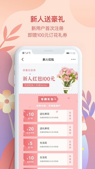 5、 新人专享福利:首次注册登录即赠送大额现金礼券,可直接抵扣订单金额,降低尝试门槛,让用户以更低成本体验高品质鲜花带来的生活乐趣。