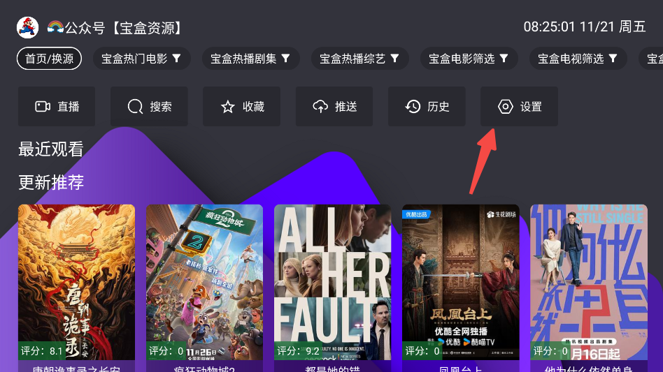 1、打开宝盒影视app已经内置源,如果失效可以点击设置按钮。