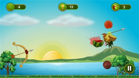 3.操控者手中的弓箭,瞄准上方掉落的这些水果,开启你的弓箭射击。