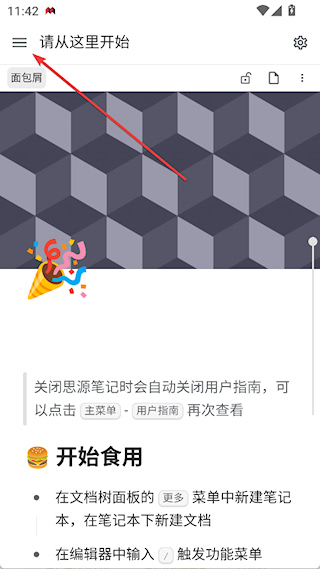 1、打开思源笔记app,点击左上角三横按钮