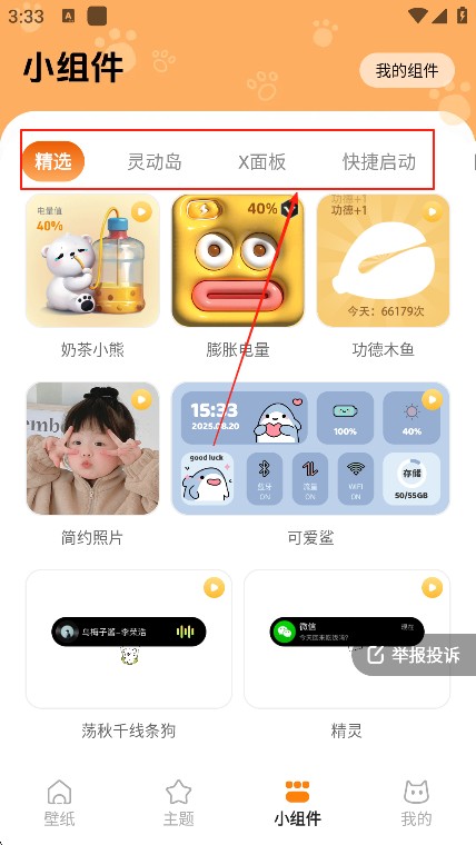 3、轻点页面顶部栏目,能切换不同组件分类。