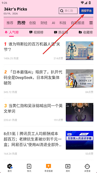 36氪是一款聚焦前沿科技与商业创新的资讯应用,为创业者和投资人提供深度报道与实时动态,汇聚全球最新产业趋势,解析商业模式变革,帮助用户把握市场脉搏,内容涵盖硬科技、新消费、企业服务等多个领域,通过专业视角挖掘高价值信息,是职场人士洞察风口的必备工具。
