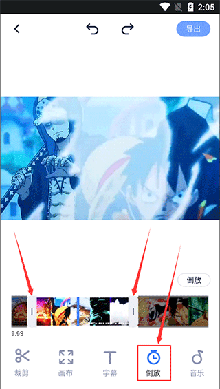 5、时间轴调整完毕后,点击上方【倒放】按钮,等待处理完成即可预览效果。