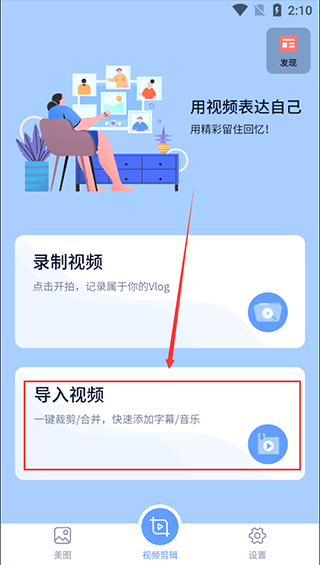 2、在主界面找到【导入视频】选项,点击进入视频导入页面。