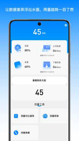 1、应用具备智能统计月剩余流量的功能,真实的数据让用户在使用过程中更加安心,再也不必为流量超额而烦恼。