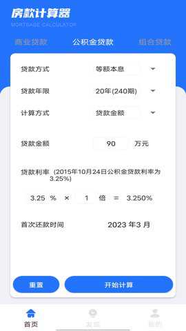3、用户可以选择等额本息、等额本金、商业贷款、公积金贷款和组合型贷款等不同的贷款方式进行计算。