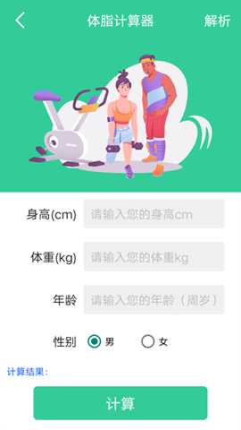 3、只需输入相关的身体数据,如身高、体重、年龄等,App便能快速计算出你的体脂率。