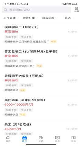 1、不论是全职还是实习,用户都可以在揭阳直聘找到自己感兴趣的工作机会。