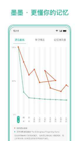 2、墨墨记忆卡还可以查看自己的记忆数据,包括遗忘曲线、记忆持久度、每日学习情况等。