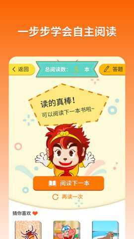 悟空阅读可以帮助孩子轻松阅读学习,更加便捷的操作方式让你可以自主阅读。通过鼓励的方式,让孩子对阅读更加感兴趣。通过一点一滴的累积,让孩子养成正确阅读的好习惯。还有精细的阅读分级,让你随时都能找到适合自己的读物。