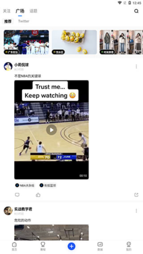 3、【发现】页分为关注、广场、话题三个板块,显示的是各类动态。