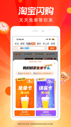 2、使用快捷通道:淘宝首页搜索“奶茶免单”,可直接跳转至活动页面。