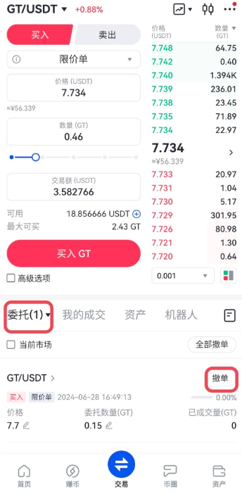 3、下单成功后,在交易页面下方的“委托”中,查看挂单情况。点击对应订单即可查看订单详情,在订单未成交之前,也可以点击委托上方的“撤单”来撤销该笔订单。