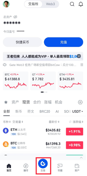 1、打开币安手机App,登录个人账户后,点击页面底栏“交易”,选择“现货”进入“现货交易”页面。